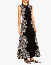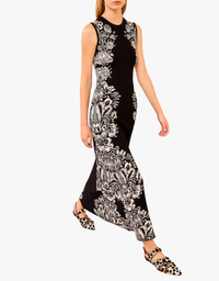 The Liana Dress captivates with white botanicals in perfect symmetry against timeless black. Crafted from stretch jacquard, it features clean lines and an elegant A-line skirt that moves with ease. A modern, feminine statement—add this standout piece to your collection today!