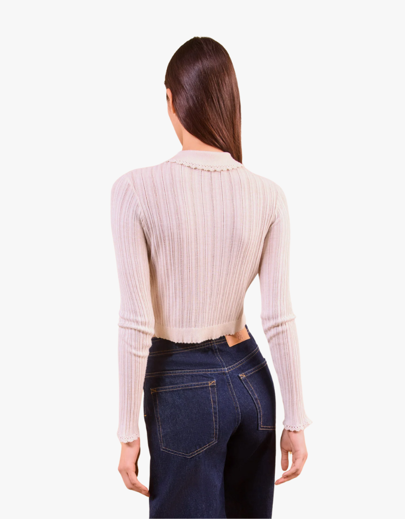 Experience effortless elegance with the Lottie Cardigan, crafted from a lightweight pointelle knit featuring subtle openwork details. This pristine white, long-sleeve piece offers a slim fit perfect for layering. Welcome this versatile wardrobe essential that combines sophistication with comfort.