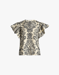 The Severine Top, crafted from cotton poplin, features a bold botanical print with subtle batik textures. With flutter sleeves and a relaxed fit, it pairs effortlessly with denim or tailored pieces. A versatile statement—add it to your collection today.