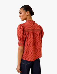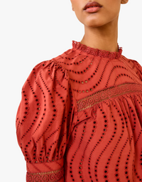 The Virginia Blouse beautifully balances allure and coverage with cascading degradé eyelets set on gentle water-washed poplin. This distinctive Ulla Johnson design features artfully puffed sleeves and is accented by delicate lace detailing, making it a standout piece.