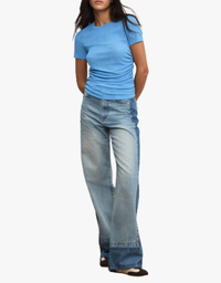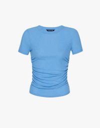 Remus elevates the everyday tee with premium stretch fabric in a rich blue and a slim, body-hugging silhouette enhanced by waist ruching. Finished with a crew neckline and short sleeves, this versatile essential pairs beautifully with denim, trousers, or skirts—discover the perfect foundation for effortless style.