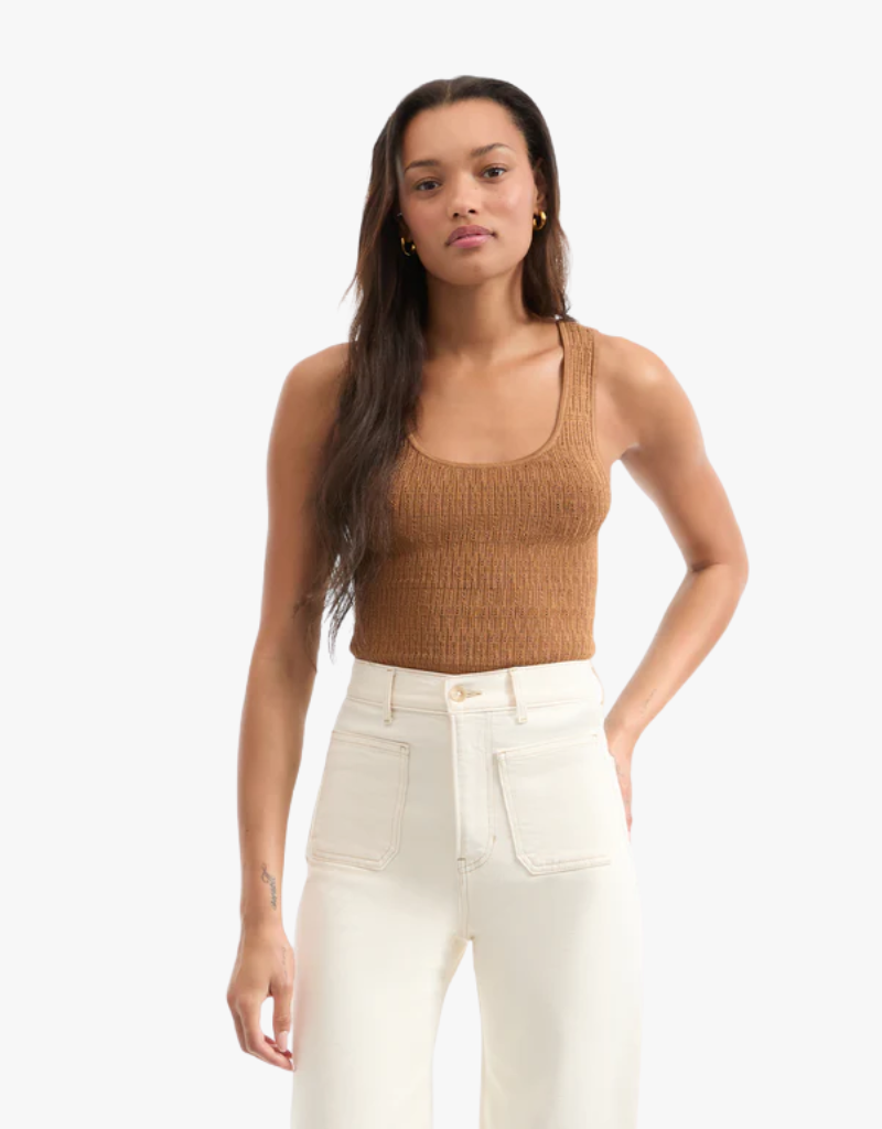 A must-have for your summer packing list, the Sandra tank top is designed to flatter—and stay wrinkle free. The body-skimming knit in sepia brown is ribbed for flattering texture and features a generous scoop neck. Tuck this sleeveless sweater top into jeans, top it with a button-down, layer it under a blazer—the options are endless.