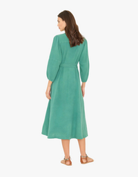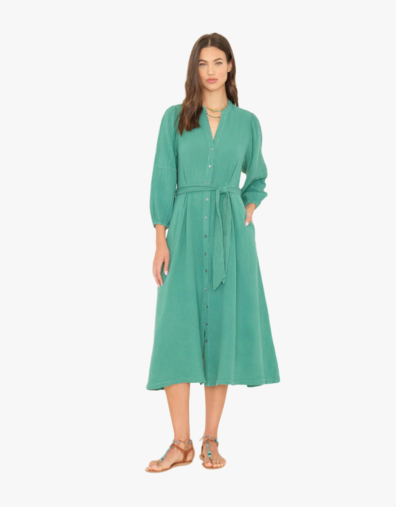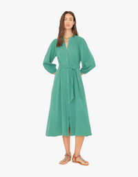 Fall in love with the Selene Dress! Made from double-faced cotton gauze, it boasts a crinkled texture, button-front design, flattering V-neck, billowy blouson sleeves, elasticized cuffs, a self-tie belt, and side seam pockets.